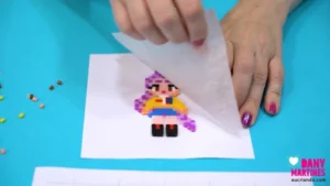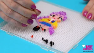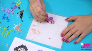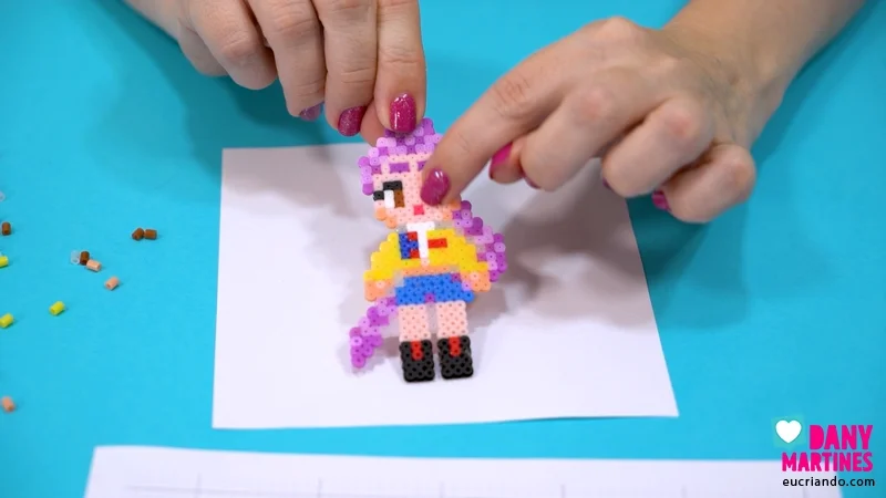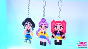 Explosão de cor e estilo! 💜✨ A Rumi ganhou vida em beads com seus tons vibrantes de roxo. Segui o molde linha por linha até revelar cada detalhe do visual dela. Usei fita crepe pra facilitar o processo e finalizei com duas texturas incríveis. Resultado? Um chaveiro cheio de energia! 🌟