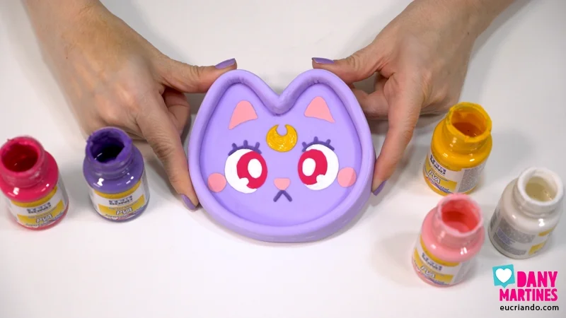 Esse porta-joias de gatinha é pura fofura! 💜🐱 Modelado em biscuit lilás, ele ganha formato inspirado na Luna e detalhes pintados à mão em cores bem vivas. A base alta ajuda a guardar anéis, brincos e tudo que vive sumindo. Mesmo sendo simples de fazer, o resultado fica super delicado, kawaii e perfeito pra decorar a cabeceira! ✨🌙