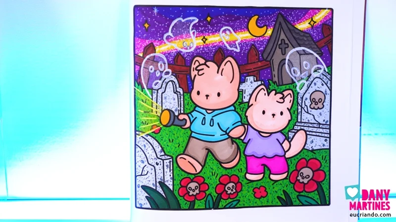 Uma galĂĄxia assustadoramente linda! đ Começo criando um cĂ©u vibrante com amarelo, rosa, roxo e azul que se espalham como energia pelo desenho. Depois entram texturas incrĂveis: madeira nas cercas, grama detalhada e lĂĄpides com efeito de pedra. Personagens ganham vida com sombras e luz. Resultado? Uma pintura cheia de tĂ©cnicas, cores e magia! âš