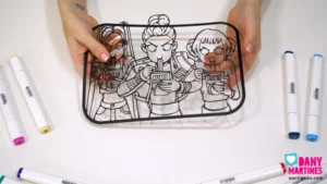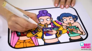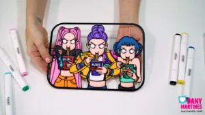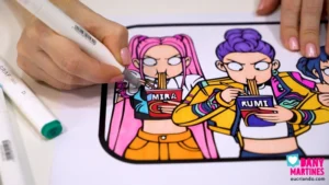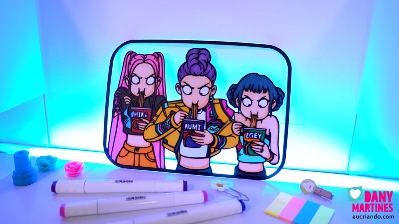 Mais um show das Guerreiras do Kpop! 💖🍜 Imprimi e colori essa cena icônica com marcadores à base de álcool, deixando o fundo vazado pra brincar com luzes coloridas. O efeito 3D com a moldura impressa é mágico — conforme a luz muda, o quadro ganha novas cores e vida. Um espetáculo visual! 🌈✨