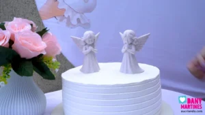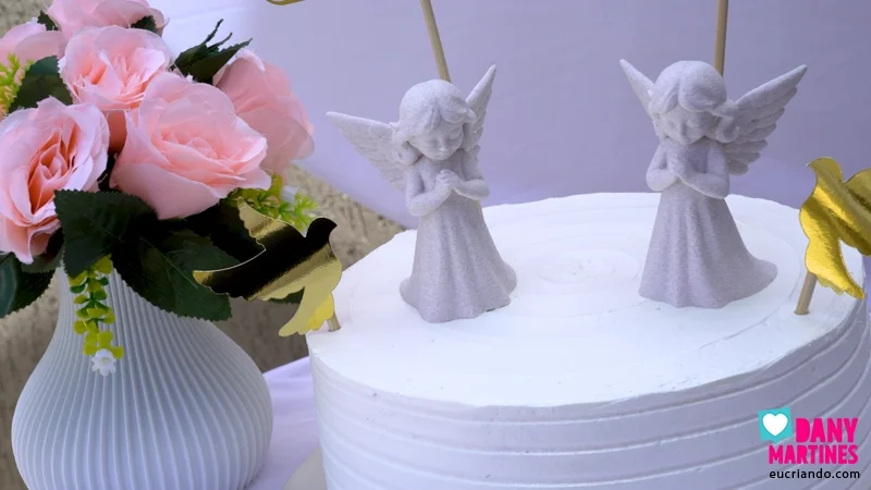 Para esse topo lindo, imprimi anjinhas em 3D e preparei peças em papel especial: banner dourado, nuvens em camadas e pombinhas delicadas. Combinei papel dourado com colorpop luminous branco para um efeito sofisticado. No final, tudo encaixa perfeitamente no bolo, criando uma decoração emocionante e cheia de significado. ✨👼🤍