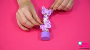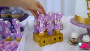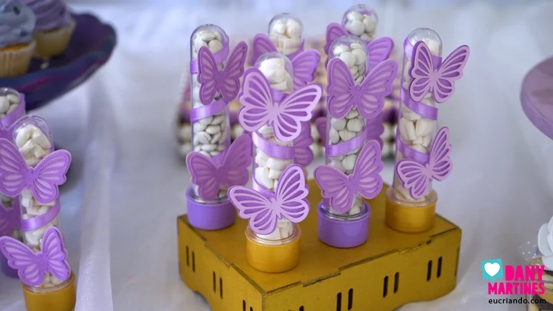 Esse tubete ficou um charme com fitinha de cetim e borboletas 3D! Enrolei a fita ao redor do tubete e colei borboletas cortadas em cardstock texturizado, deixando cada par voar para um lado. Combinei tampas roxas e douradas, criando uma decoração harmoniosa e cheia de elegância. Fica lindo demais na mesa! 🦋✨